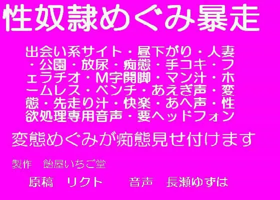 淫語アダルトボイス製作サークル飴屋いちご堂。 今回は、変態人妻のめぐみの痴態をお聞きください。 出会い系サイトで知り合ったケンさんとの、公園での変態プレイ。 フェラ・放尿・生マ○コ・けつマ○コ・淫語大好きな方にお勧め。 壊れ気味のめぐみのエロボイスを聞いてください。 今回は約28分収録。 声優のアドリブによる、リアルなあえぎ声です。 性欲処理専用、抜き専ボ…