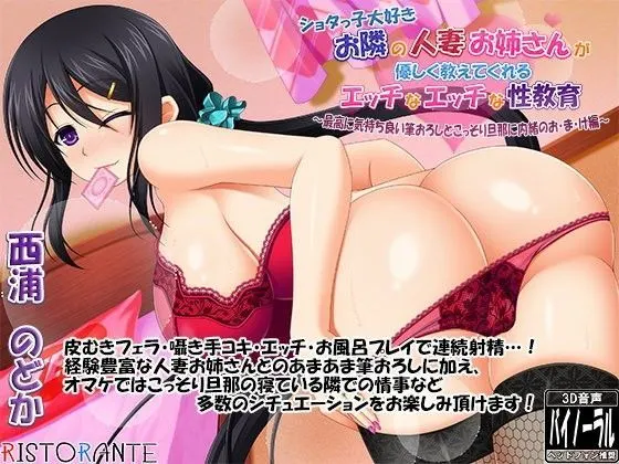 【2015-06-22】に発売した、同人サークル【ristorante】の人妻エロコレクションです。【お隣の人妻お姉さんが優しく教えてくれるエッチなエッチな性教育〜最高に気持ち良い筆おろしとこっそり旦那に内緒のおまけ編〜】8本(約54分)+α全てネタバレします。